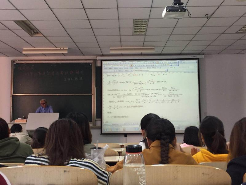 陈颖老师以“2017年江苏及全国高考试题解析”为题,重点分析了2017年江苏省高考数学试卷各大题的解题过程、解题方法、试题特点、命题背景及命题思路。同时,对2017年全国高考数学试题也进行了比较详细的分析。陈颖老师在报告中从数学解题所要具备的基础知识、基本技能,如何透彻理解教材,如何发挥数学思想方法在解题中的指导作用,解高考题需要注意的问题等方面深入分析了提高数学解题能力必备条件和基本途径。他认为,提高数学解题能力首先要打好数学基础,这是提高解题能力的根本;其次,要掌握一些重要的数学方法和一些常见的数学模式,这是提高解题能力的重要途径;再次,要善于进行题后总结,这是通过解题能力的保障。他认为,作为未来的数学老师,要充分利用天美视频 的有利条件,打好坚实的数学基础,提高自己的教育教学技能,争取将来成为本专业的佼佼者。