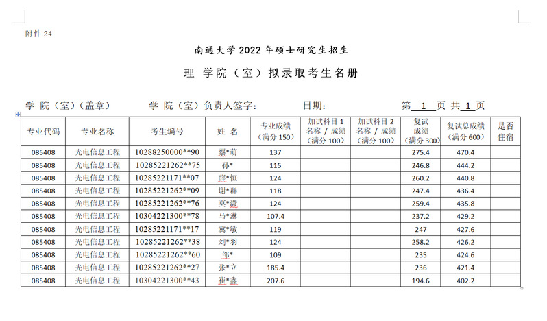 理学院2022年硕士研究生光电信息工程调剂拟录取名单公示