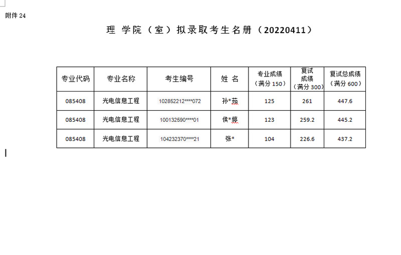 理学院2022年硕士研究生(光电信息工程)调剂第二批拟录取名单20220411