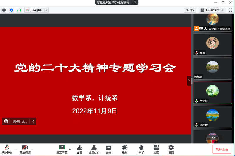 11月9日下午,理学院数学系党支部、计统系党支部利用腾讯会议在线召开专题学习会,深入学习贯彻党的二十大精神。