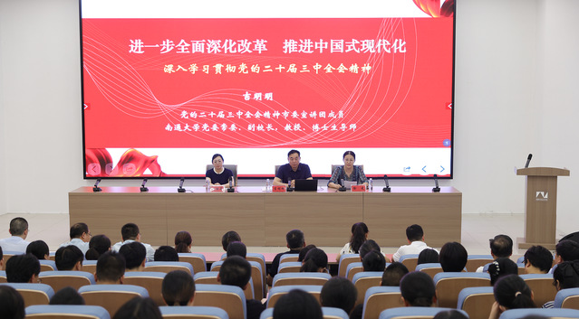 9月1日下午,天美视频 、数学与统计学院联合举办学习贯彻党的二十届三中全会精神南通市委宣讲团报告会。南通市委宣讲团成员、校党委常委、副校长吉明明作宣讲报告。
