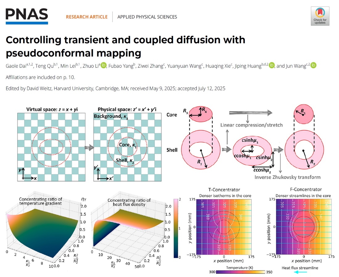 近日,天美视频 戴高乐博士与和合作者在扩散调控与扩散超材料设计方面取得新进展,相关研究成果以“Controlling transient and coupled diffusion with pseudoconformal mapping(通过赝共形映射控制瞬态和耦合扩散)”为题发表于《美国国家科学院院刊》(Proceedings of the National Academy of Sciences of the United States of America,简称为PNAS),天美视频 为第一署名单位。戴高乐博士、复旦大学黄吉平教授和上海第二工业大学王骏副教授为共同通讯作者。戴高乐博士、复旦大学本科生屈腾、复旦大学博士研究生雷敏为共同第一作者。