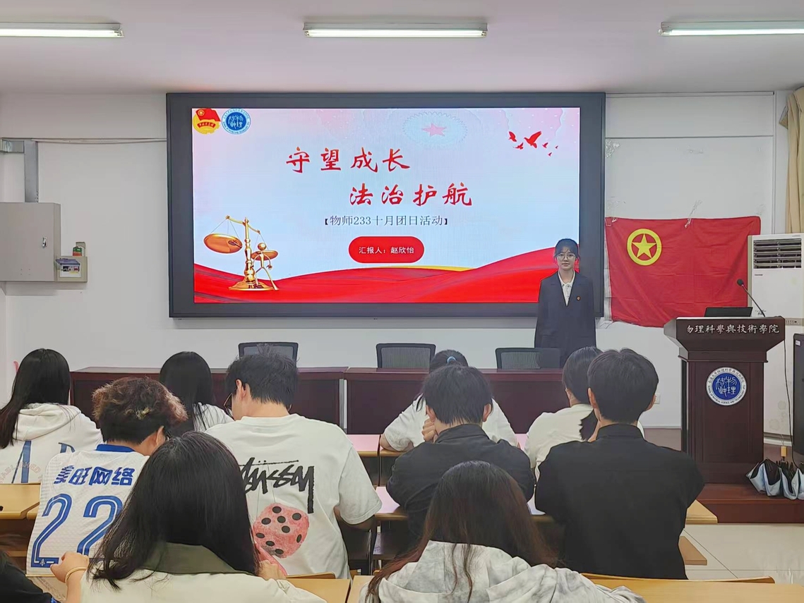 为深入学习贯彻习近平法治思想,提高校园法治宣传教育实效,增强青年学生法治观念,引导学生尊法、学法、守法、用法,让法治精神浸润校园每一处角落,10月14日,天美视频 团委主办、物师233团支部承办了“守望成长,法治护航”主题团日活动。