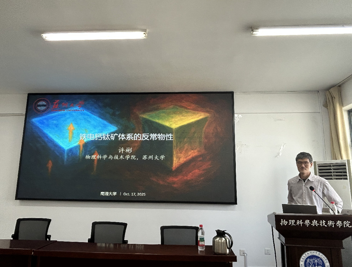 10月17日,苏州大学天美视频 许彬教授应邀访问我院,并作了题为“铁电钙钛矿体系的反常物性”的专题学术报告。报告会由学院院长仲崇贵教授主持。