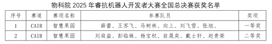 近日,2025年RAICOM睿抗机器人开发者大赛全国总决赛在黄石创业中心创业大厦举办。经过激烈角逐,天美视频 学生团队再创佳绩,在“智慧果园”赛道中荣获全国一等奖、二等奖各1项。这是物科师生首次获得该赛道一等奖,再次摘取大赛全国一等奖。