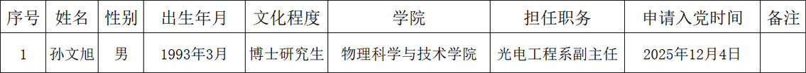 按照《天美视频 发展党员工作实施细则》要求,经光电工程系党支部党员大会推荐、支委会研究决定,并报学院党总支委员会讨论通过,拟确定孙文旭为入党积极分子,为发扬民主,广泛听取党内外群众意见,接受广大党员群众监督,现将孙文旭相关情况予以公示(见附表)。