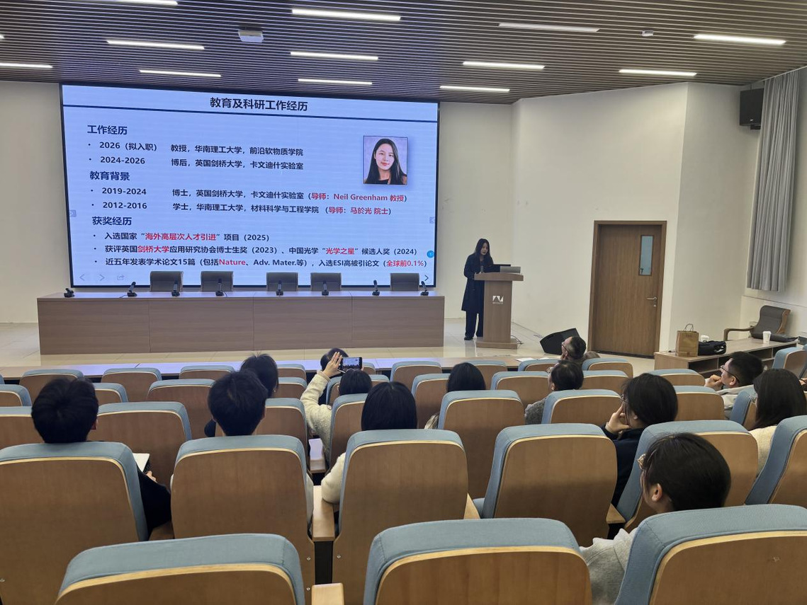 在交流环节,孙雨琦结合自身科研经历,与现场师生围绕钙钛矿发光器件的研究热点、实验方法及未来发展方向等问题进行了深入交流。本次学术报告内容丰富、前沿性强,进一步拓宽了学院师生的学术视野,增进了大家对新型发光材料与器件物理研究前沿的了解,激发了师生浓厚的学习兴趣和科研热情。