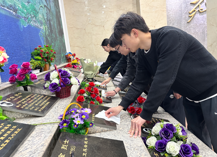 活动在庄严的国歌声中正式开始,全体成员肃立齐唱中华人民共和国国歌,随后垂首默哀,向为民族独立、人民解放英勇献身的革命先烈致以最深切的缅怀。在纪念广场上,大家整齐列队,依次上前敬献鲜花,一束束鲜花在细雨中静静绽放,寄托着对英烈的无限哀思与崇高敬意。献花仪式结束后,成员们进入室内墓区,开展墓碑擦拭工作。大家轻拭碑面、细致整理,在庄重安静的环境中,用最朴素的方式表达对先烈的敬仰之情,在一拭一净之间感悟初心与使命。